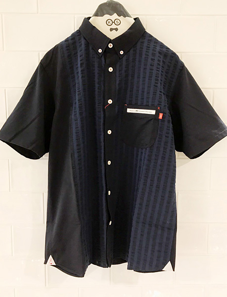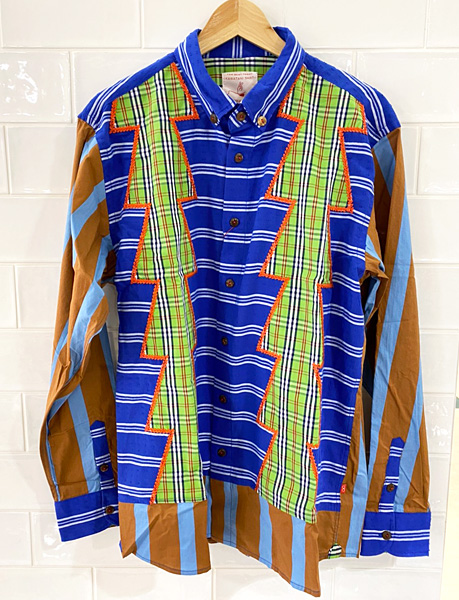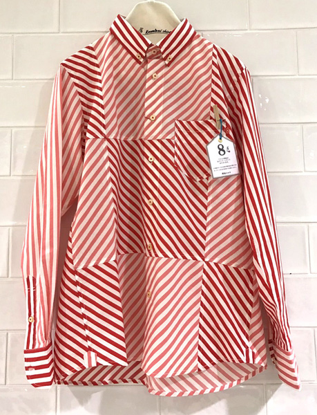 ぐるんぐるん。ストライプ柄の反復。ストライプを繰り返し組み合わせた、幾何学模様なこのシャツはテクノミュージックから着想を得て生まれたユニークな1枚。本当に見ているたけで目が回りそう!!