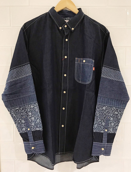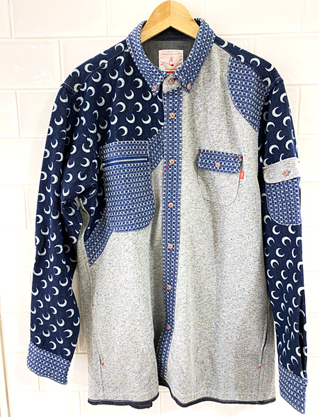 デニムと裏毛の掛けあわせが愉しい男心をくすぐるシャツ。 近世大名としては仙台藩の初代藩主である伊達政宗をイメージして作ったシャツです。 一番のポイントはやはり政宗公の象徴でもある眼帯を思わせる右胸のデザイン。本体は肌触り良く柔らかなメランジ調の裏毛素材で、デニムの無骨なイメージをマイルドに中和させる愉しさ溢れる生地合わせです。
