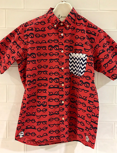 オリジナルプリントポップなメガネ柄のプリントシャツが欲しかったので生地から作りました!きめの細かい生地なので肌触りも良くジグザグのポケットになりリニューアル。
